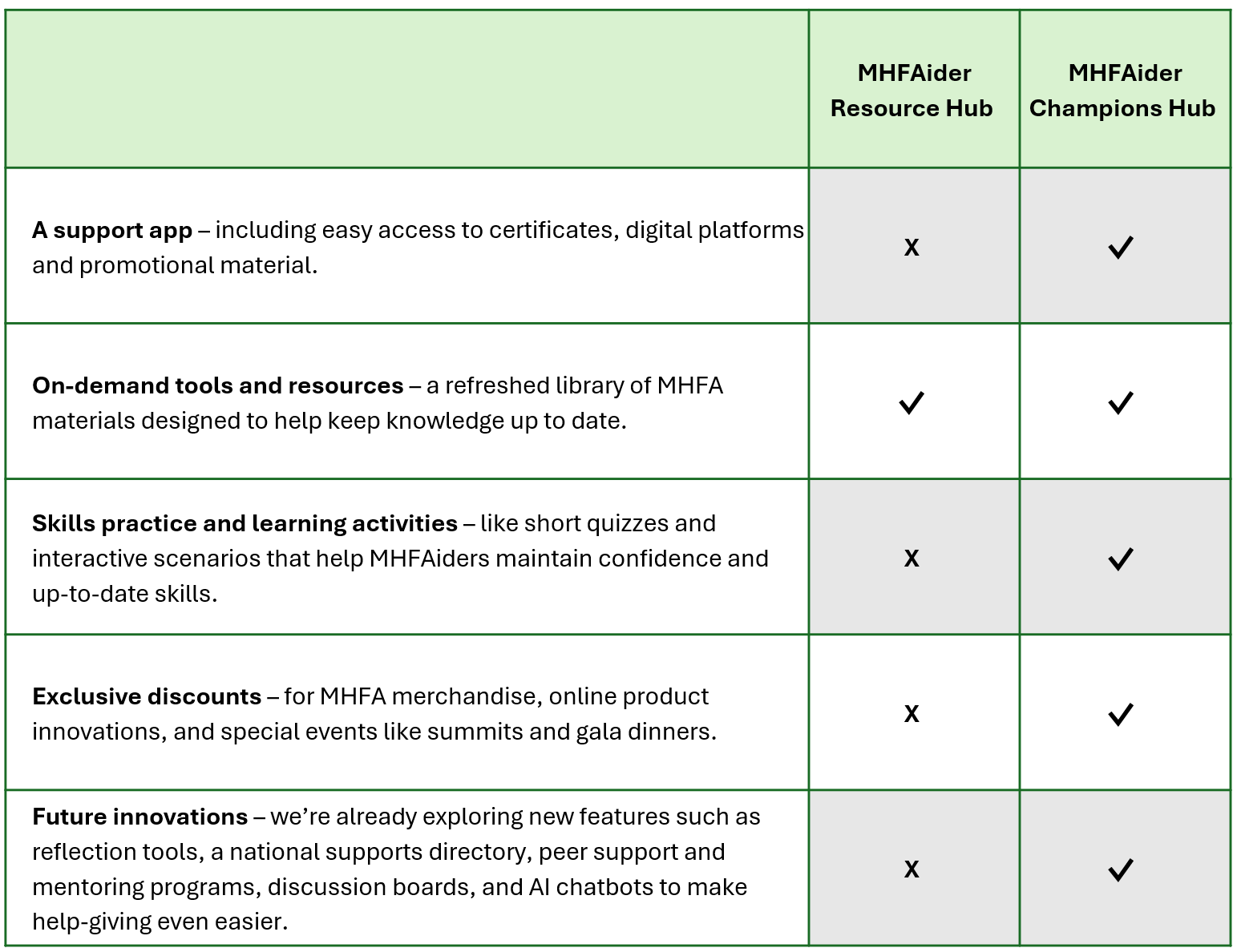 While the Resource Hub is a static page that directs MHFAiders to resources, the Champions Hub offers an expanded membership experience designed to keep MHFAiders more connected, engaged and supported over time.