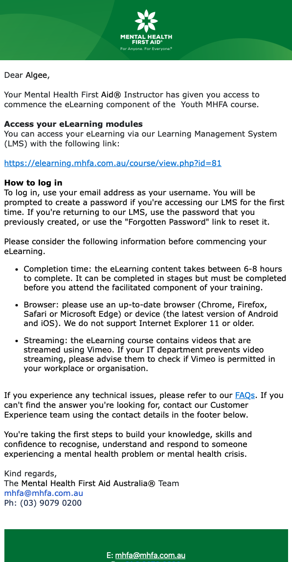 Your participant will need to follow the instructions on the email to access and complete their eLearning.